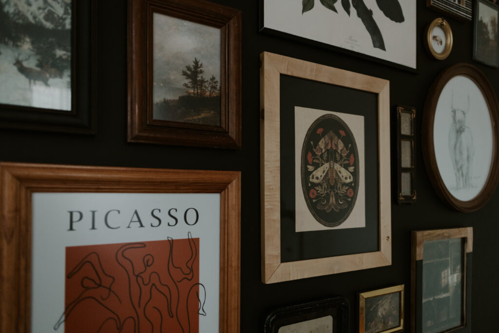 The centralized moth print was a huge inspiration and jumping off point on this wall. Once I spotted that piece on Etsy, I knew it was time to dive in deeper and get this project on the road. It was soon after that that I found the raven print and for that one, I had such a specific vision in mind. I knew I wanted just one piece that was far larger than the rest and I wanted it to bring in an element of negative space, while still leaning into and establishing the darker, moodier feel I was envisioning. A raven was perfect, even serendipitous. A raven is the icon I designed for this small business of mine and it’s the tattoo that covers much of my right arm (his wings extend and end where my camera begins). If you’ve seen me irl, you’ve probably also witnessed this deep blue corvus that flies on my forearm. Ravens are commonly said to symbolize wisdom, intelligence and transformation and in Norse mythology, they’re believed to bridge the gap between the human world and the divine. It was just a couple of years ago, many years after having already developed this love and admiration for these sleek black creatures that shine blue in the light of the sun that I took one of those popular DNA tests and learned I am majorly Nordic as well (42% Norway, 6% Sweden & Denmark, 4% Finland) – so you see what I mean? It’s all so serendipitous!
